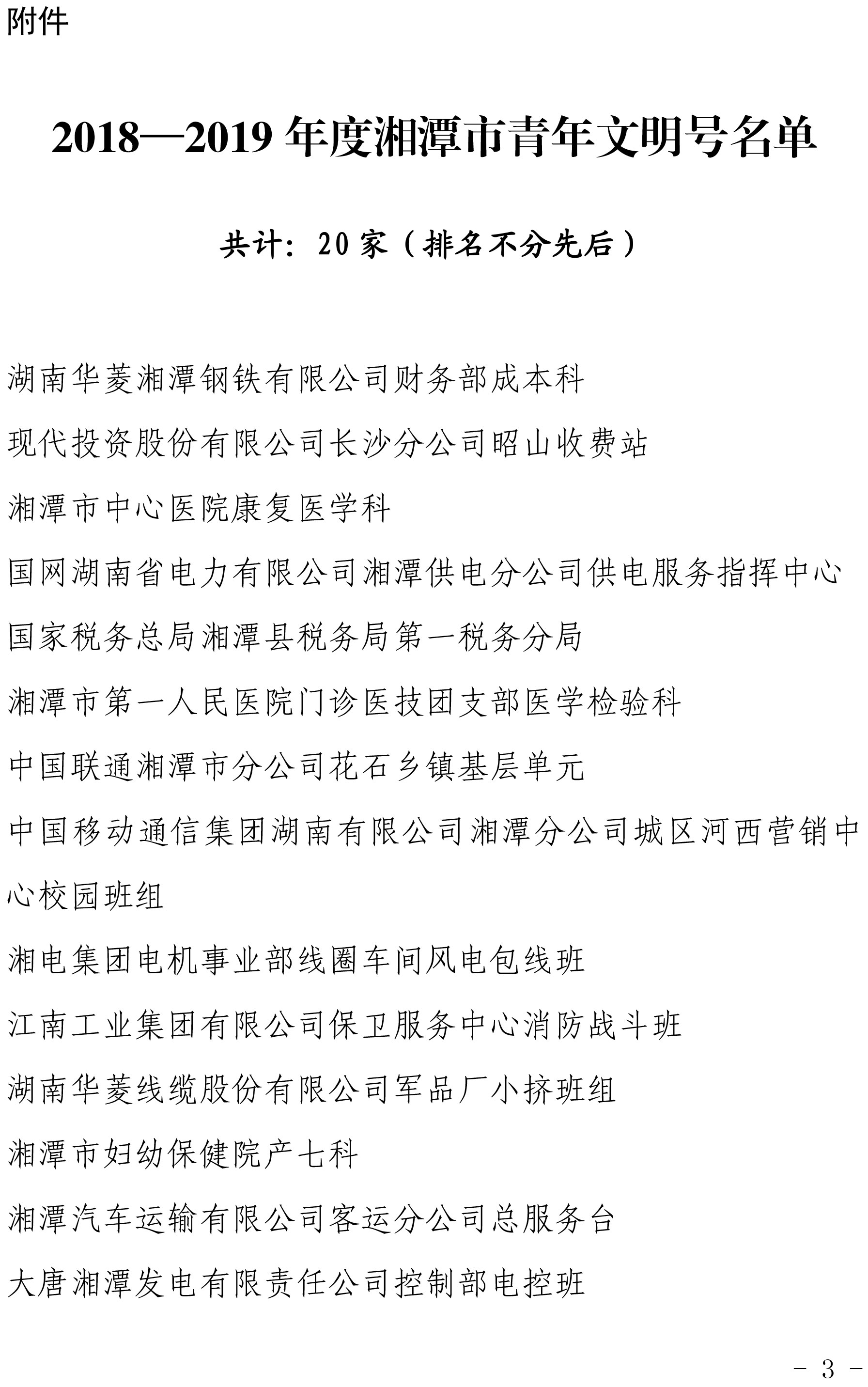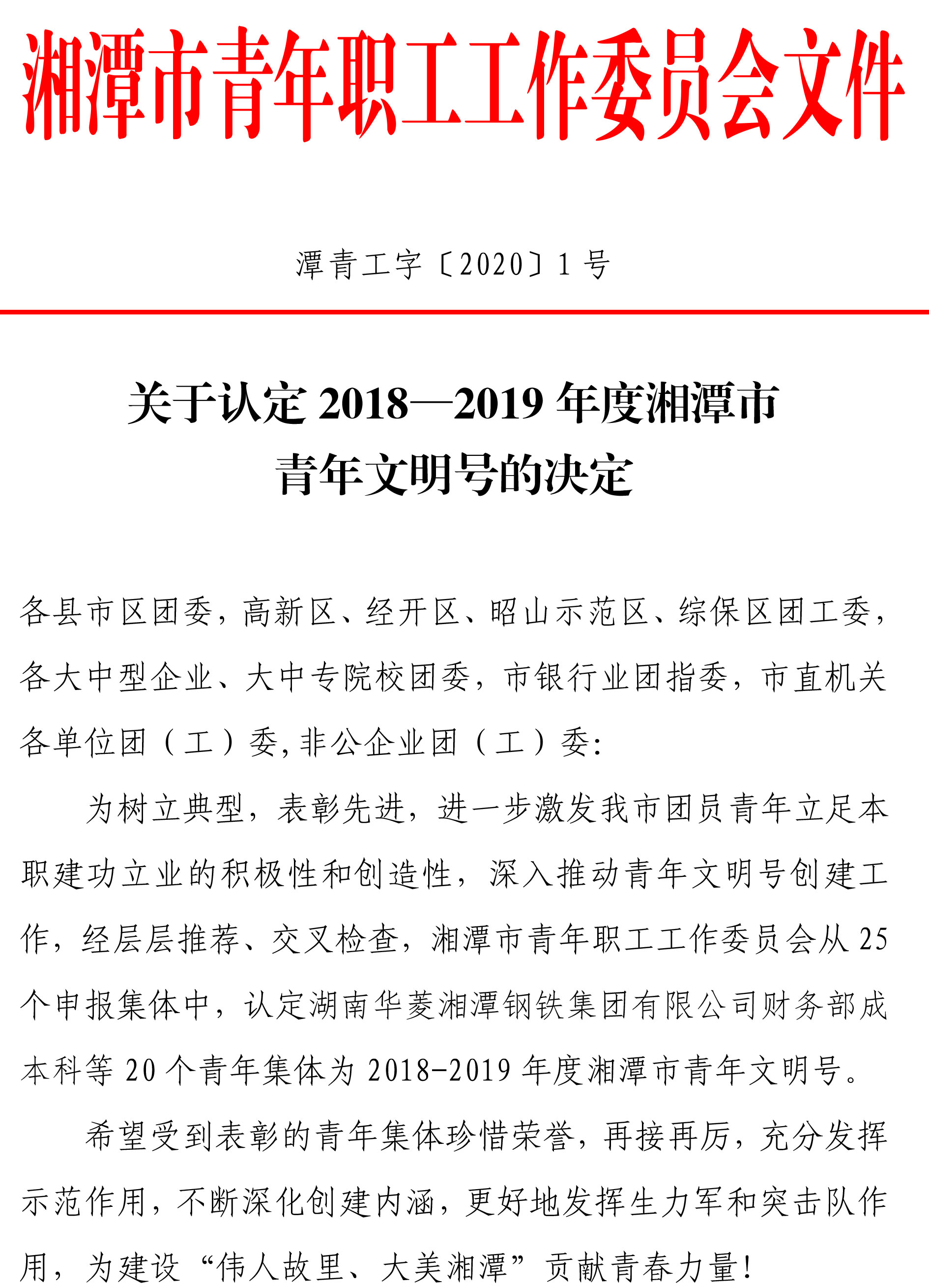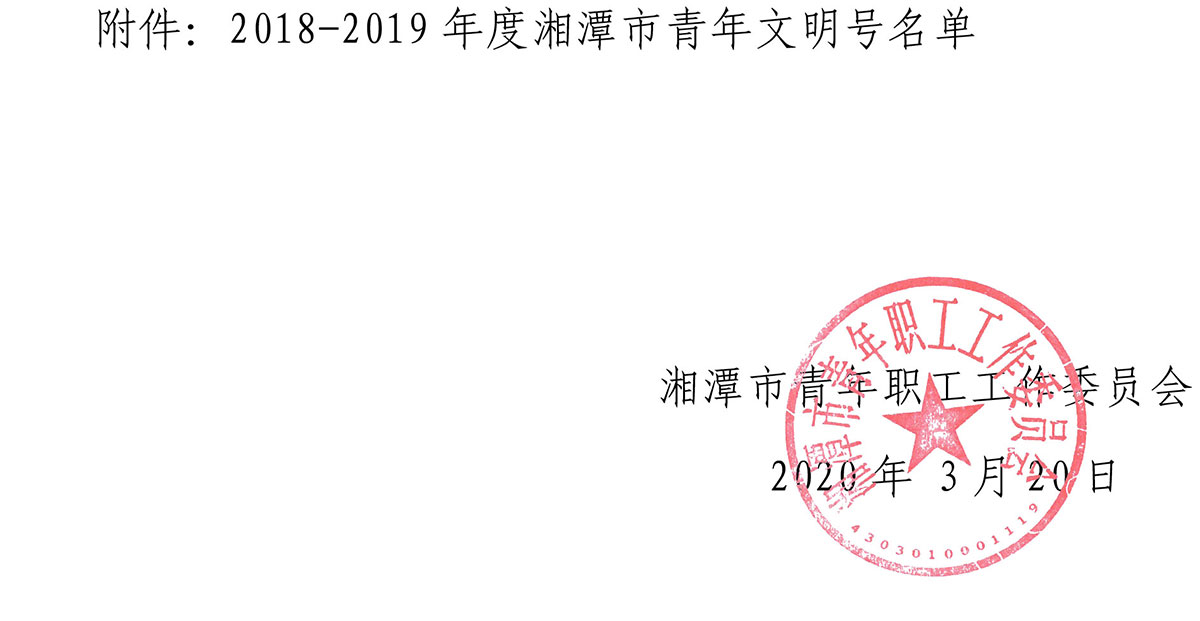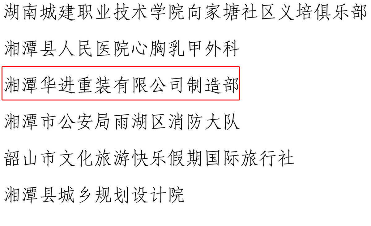 為樹立典型,表彰先進(jìn),進(jìn)一步激發(fā)湘潭市團(tuán)員青年立足本職建功立業(yè)的積極性和創(chuàng)造性,深入推動(dòng)青年文明號(hào)創(chuàng)建工作,經(jīng)層層推薦、交叉檢查,湘潭市青年職工工作委員會(huì)從 25個(gè)申報(bào)集體中,認(rèn)定湘潭華進(jìn)重裝有限公司制造部等 20 個(gè)青年集體為 2018-2019 年度湘潭市青年文明號(hào)。