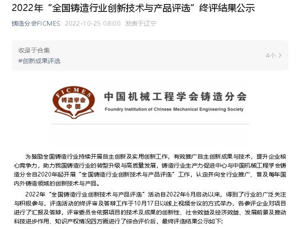 2022年10月,華進(jìn)重裝公司申報鑄造應(yīng)用項(xiàng)目——高強(qiáng)度耐磨合金球墨鑄鐵的應(yīng)用,被評定為“2022年度全國鑄造行業(yè)創(chuàng)新成果”。鑄造行業(yè)生產(chǎn)力促進(jìn)中心與中國機(jī)械工程學(xué)會鑄造分會為鼓勵全國鑄造行業(yè)持續(xù)開展自主創(chuàng)新及實(shí)用創(chuàng)新工作,有效推廣自主創(chuàng)新成果與技術(shù),提升企業(yè)核心競爭力,助力我國鑄造行業(yè)的轉(zhuǎn)型升級與高質(zhì)量發(fā)展,自2020年起開展“全國鑄造行業(yè)創(chuàng)新技術(shù)與產(chǎn)品評選”工作,認(rèn)定并向全行業(yè)推廣、普及每年國內(nèi)外鑄造領(lǐng)域的創(chuàng)新技術(shù)與產(chǎn)品。評選依據(jù)申報項(xiàng)目的技術(shù)及成果的創(chuàng)新性、社會效益及經(jīng)濟(jì)效益、發(fā)展前景及推動科技進(jìn)步作用、知識產(chǎn)權(quán)情況四個方面進(jìn)行綜合評價,最終評選出10個自主創(chuàng)新成果為“2022年度全國鑄造行業(yè)創(chuàng)新成果”。